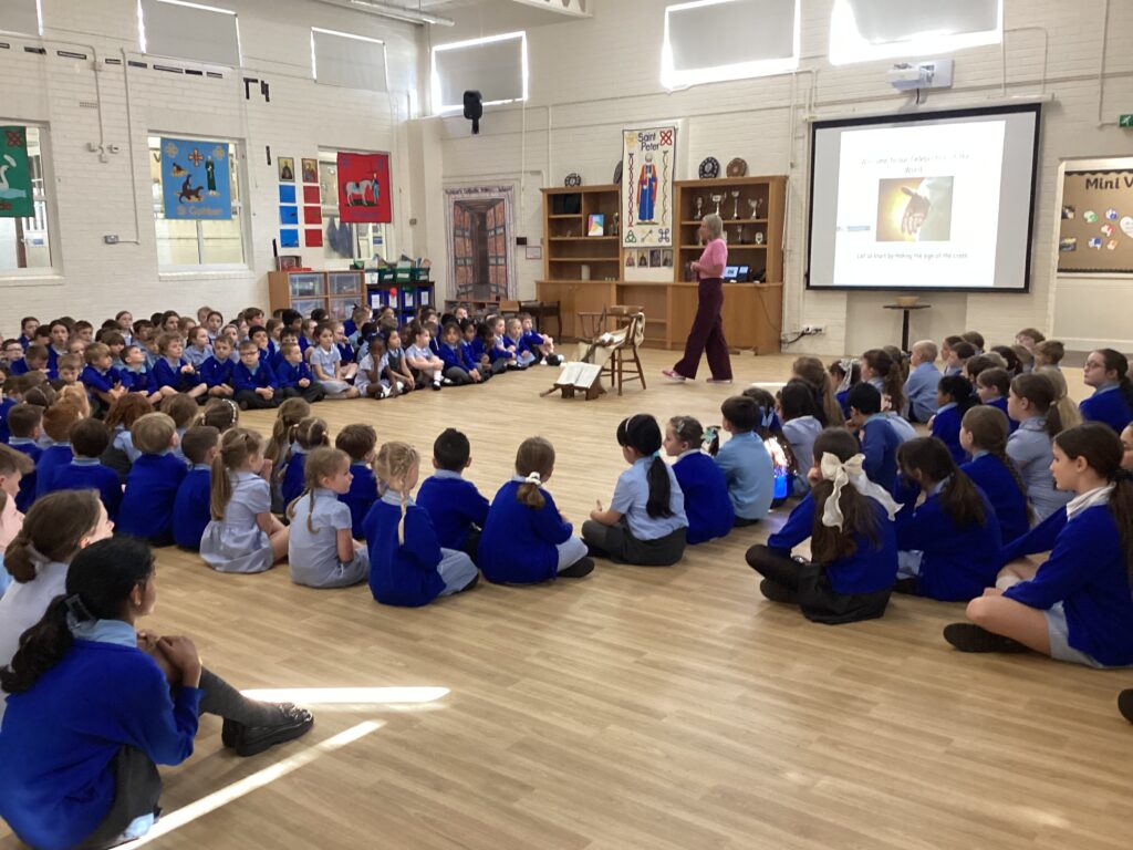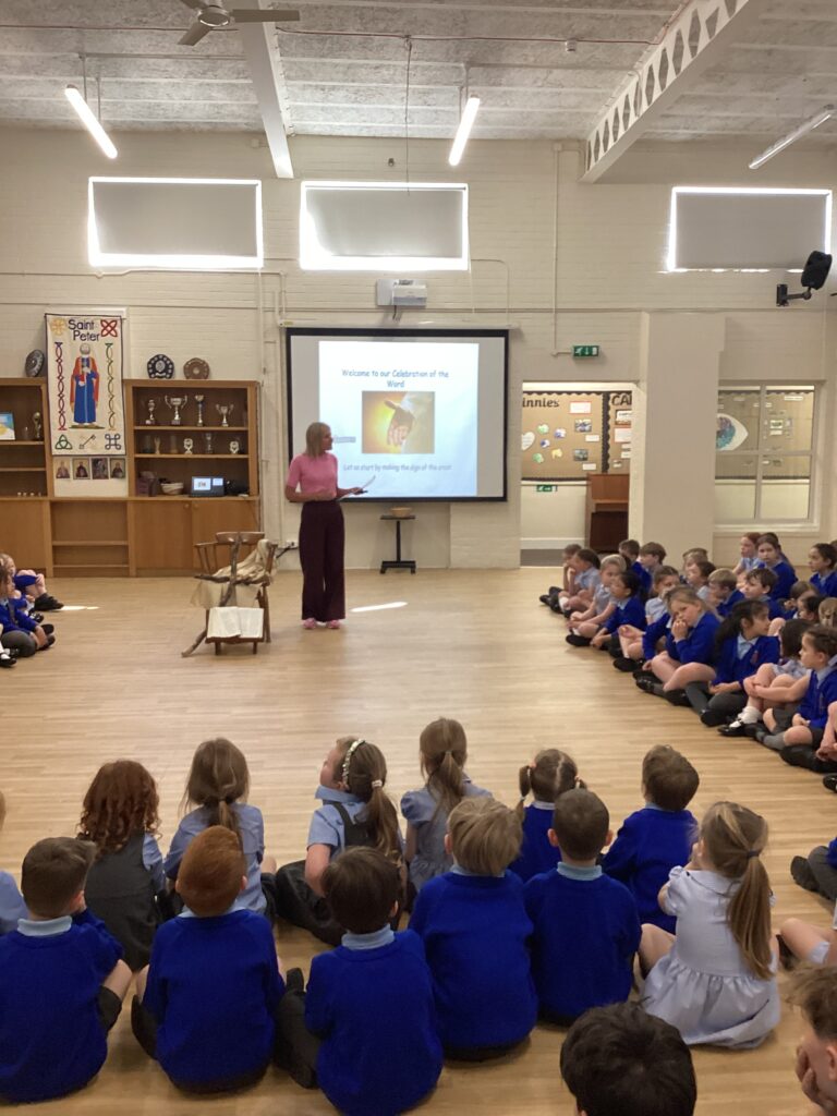 Mrs McArthur led us in prayer this morning, as we gathered together as one St. Peter’s family after the Easter holidays. Our focal point is draped in gold, preparing for the feast of Pentecost.