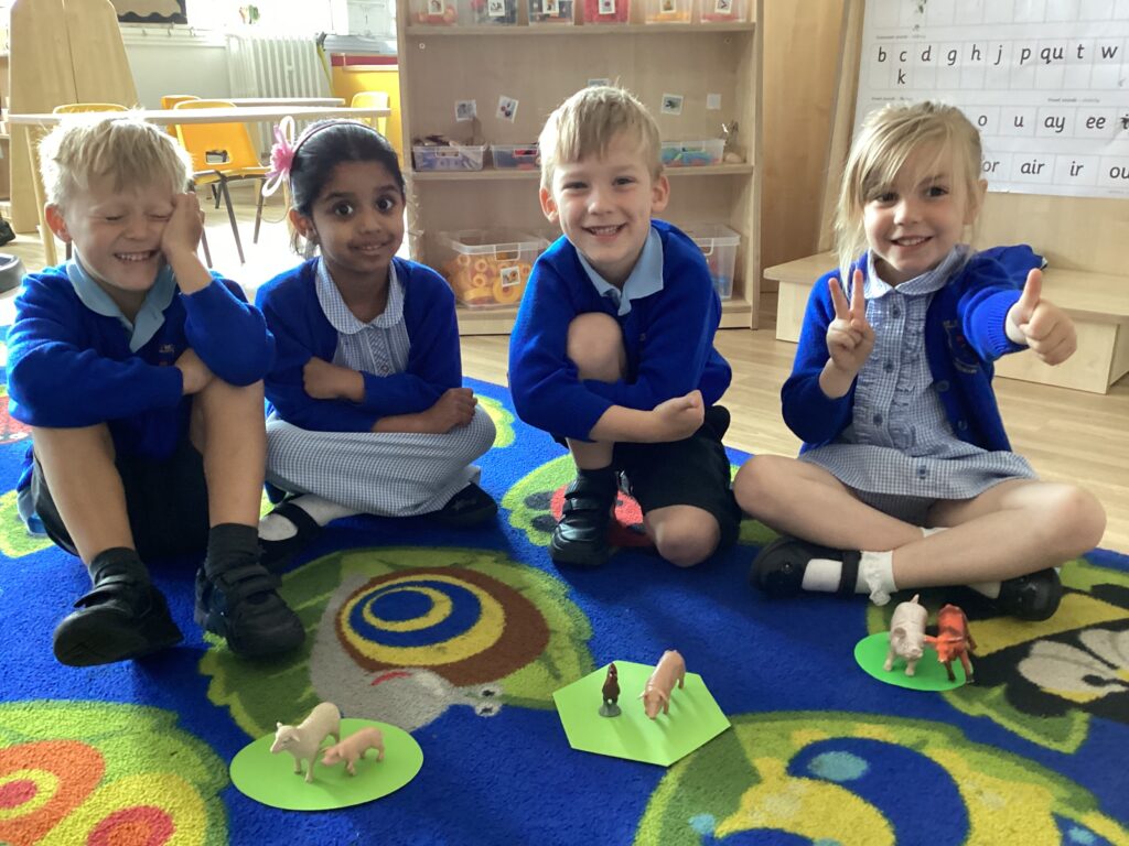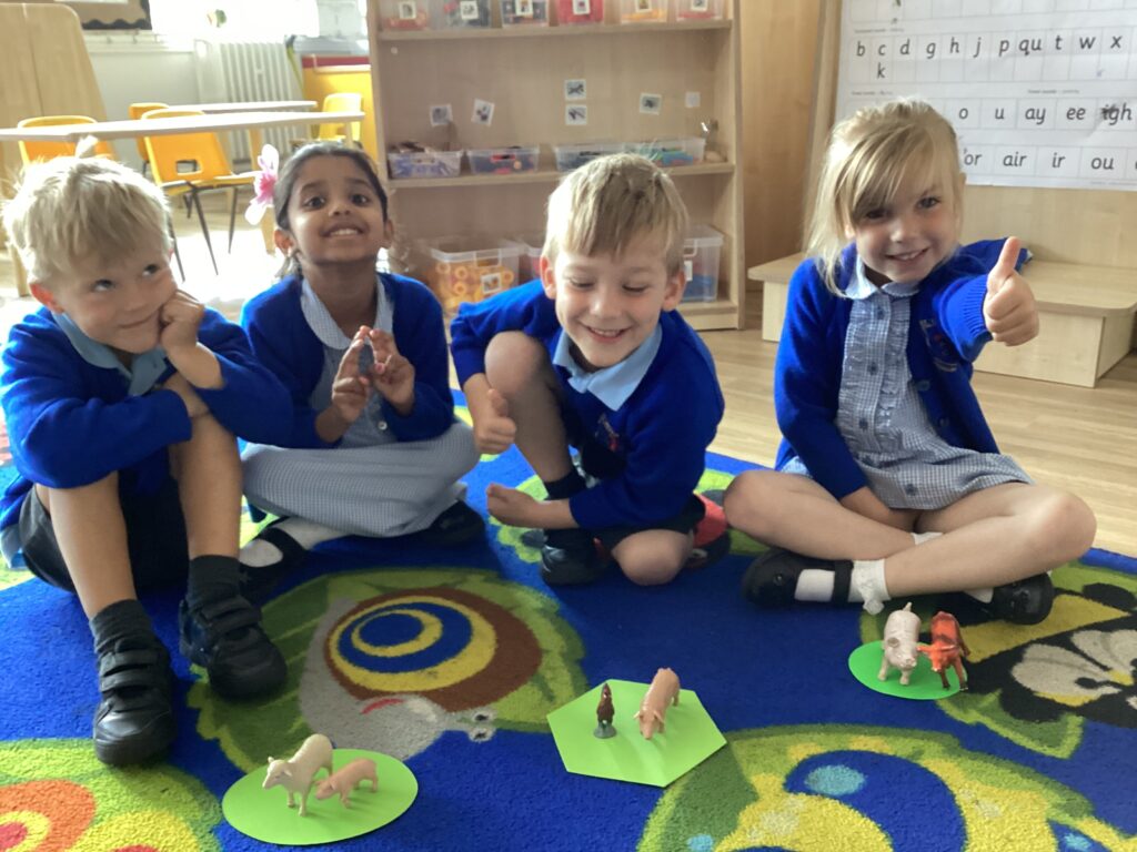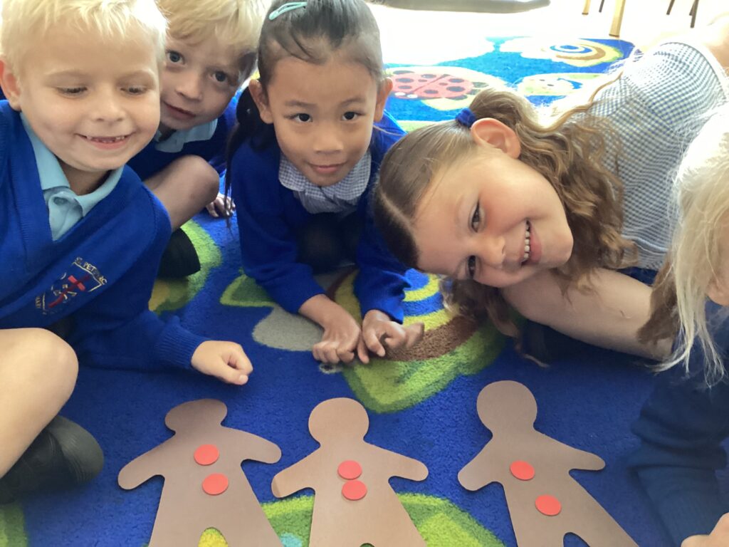 In maths, we looked at grouping. We talked about how we can count to ensure we’ve grouped equally. We were shown a group of animals and told how many needed to go in each field – how many fields would we need? Then we were shown some buttons – how many gingerbread will we need if each wears 3 buttons?