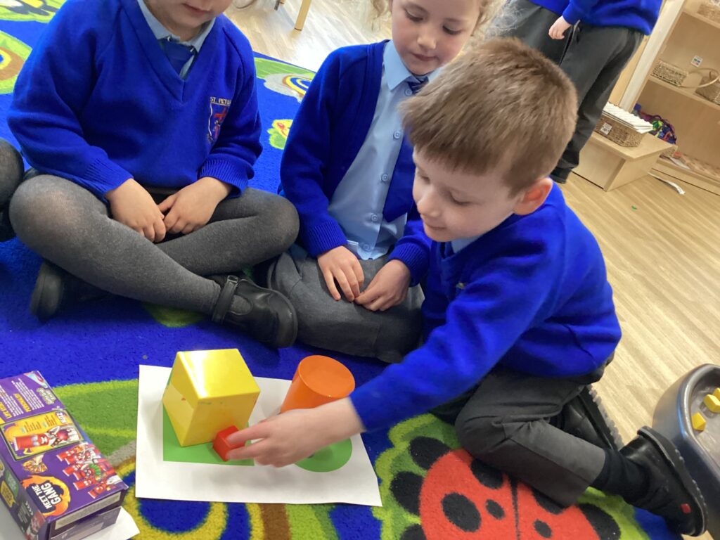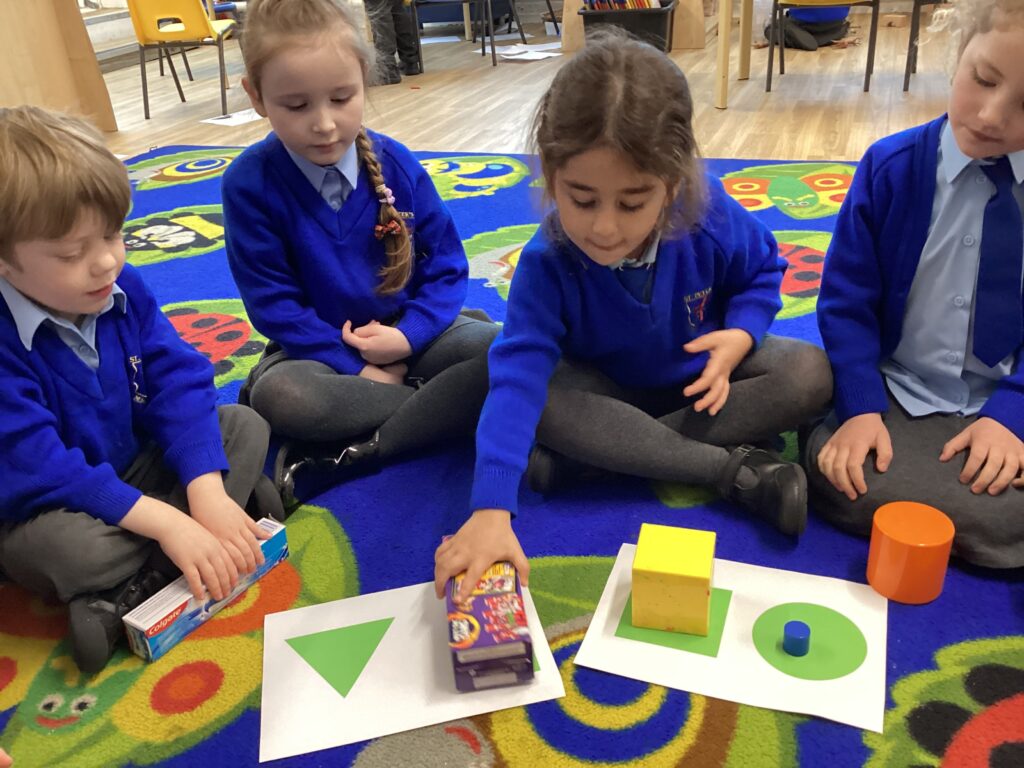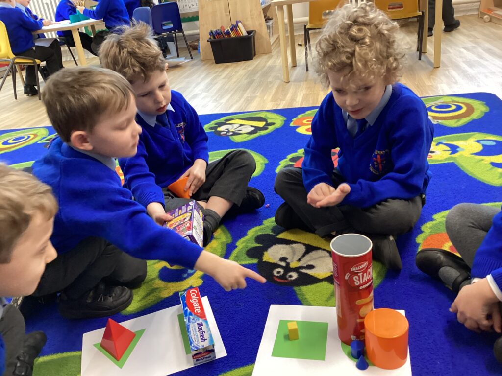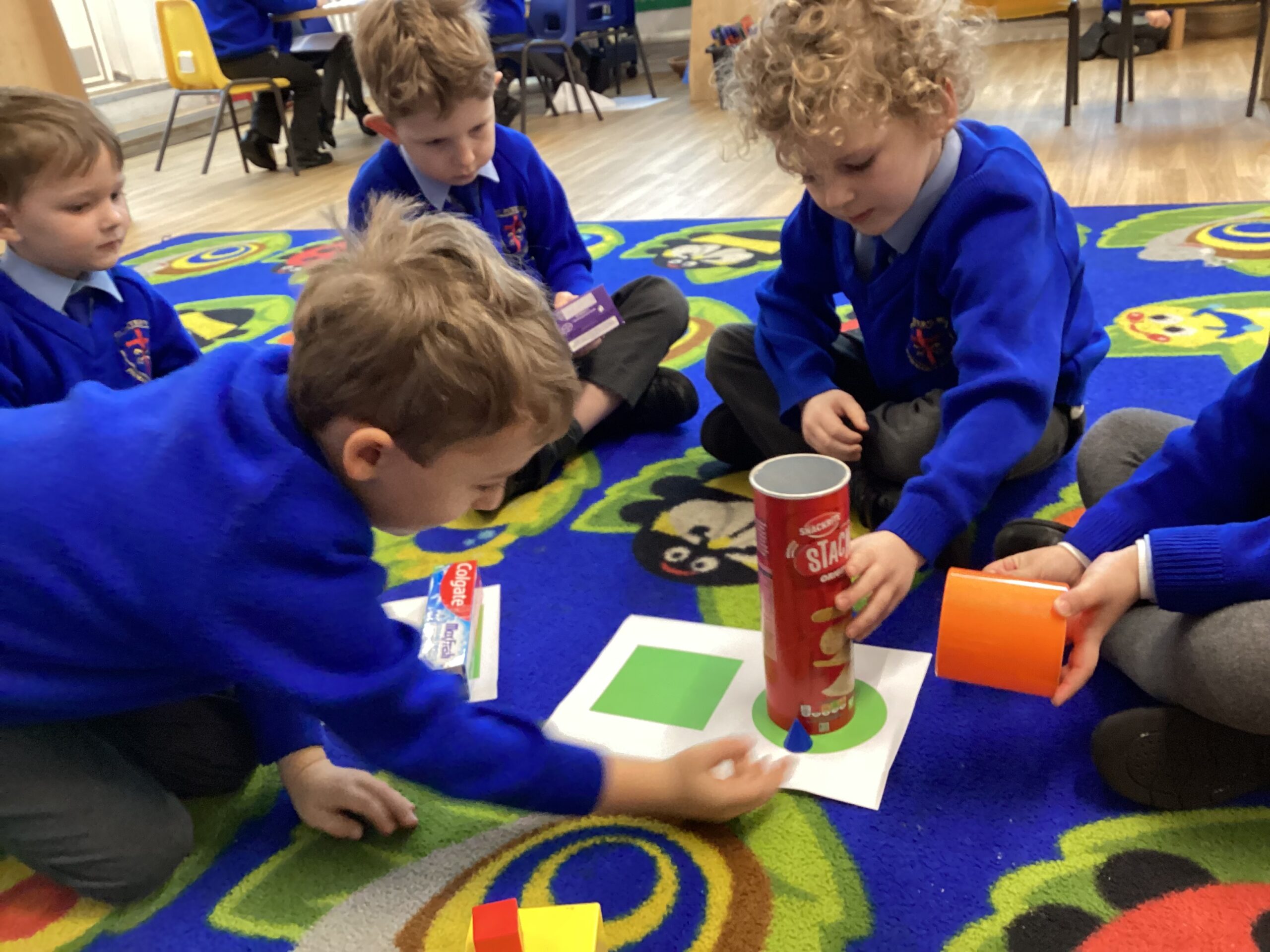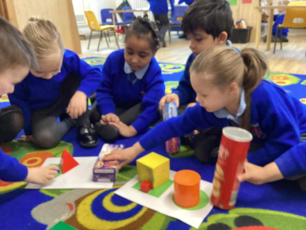 This week, we’re learning about 3D shapes. We know that whereas 2D shapes are flat and can’t be picked up, 3D shapes can be picked up and explored. We now know that we can see 2D shapes in the flat faces of 3D shapes. Today, we played a game were we had to guess which 3D shape had been used to print a 2D shape.