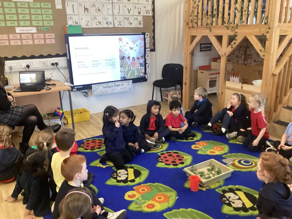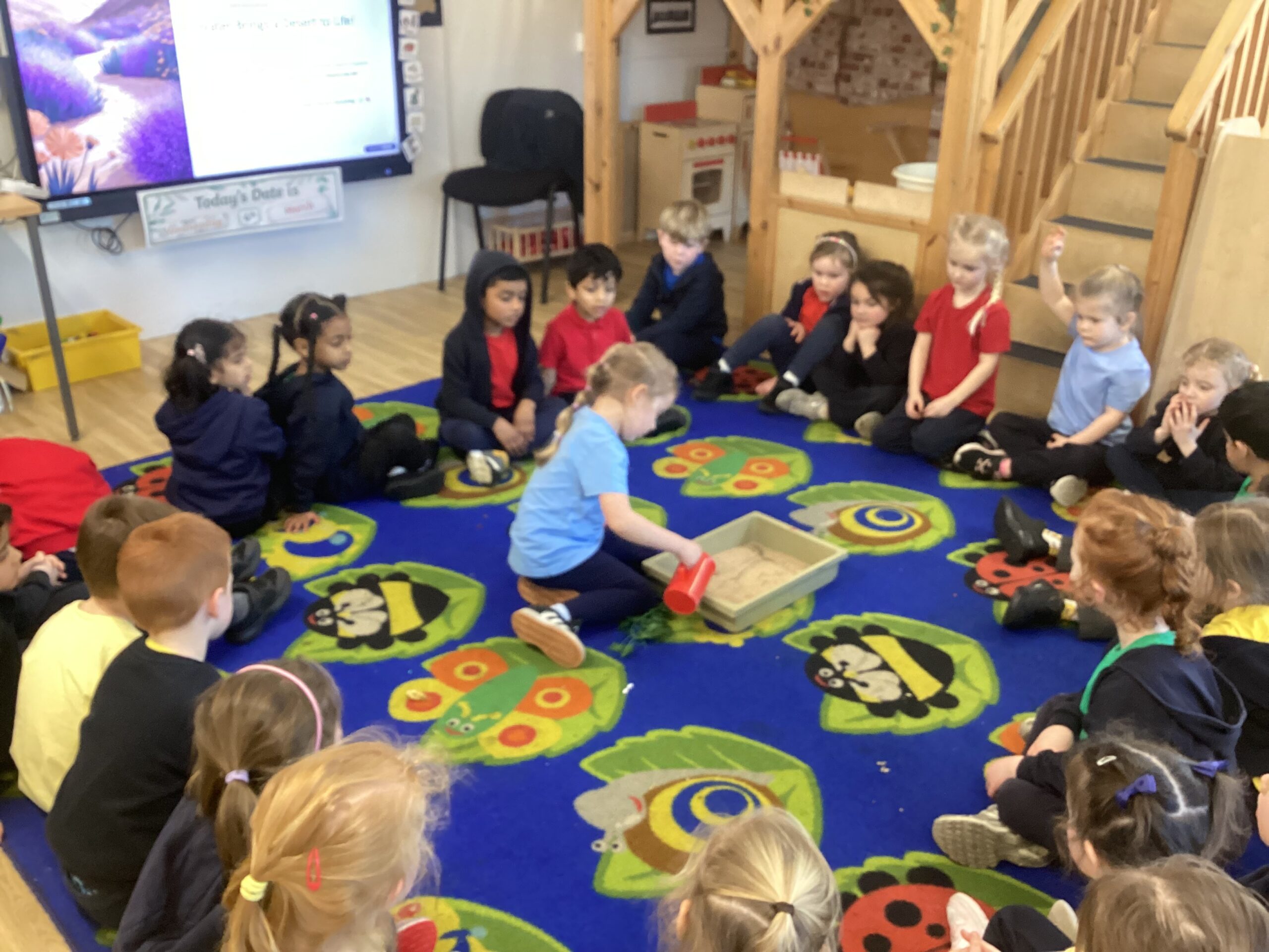Last week was hinge week where we transition from one R.E. ‘branch’ to the next. We moved from ‘Galilee to Jerusalem’, to ‘Desert to Garden’. We looked at images of deserts and thought of adjectives to describe them. We then talked about gardens and the different jobs needed to look after them. To finish, we poured water onto sand then dropped vegetation on top to mimic how a desert blooms when it rains.