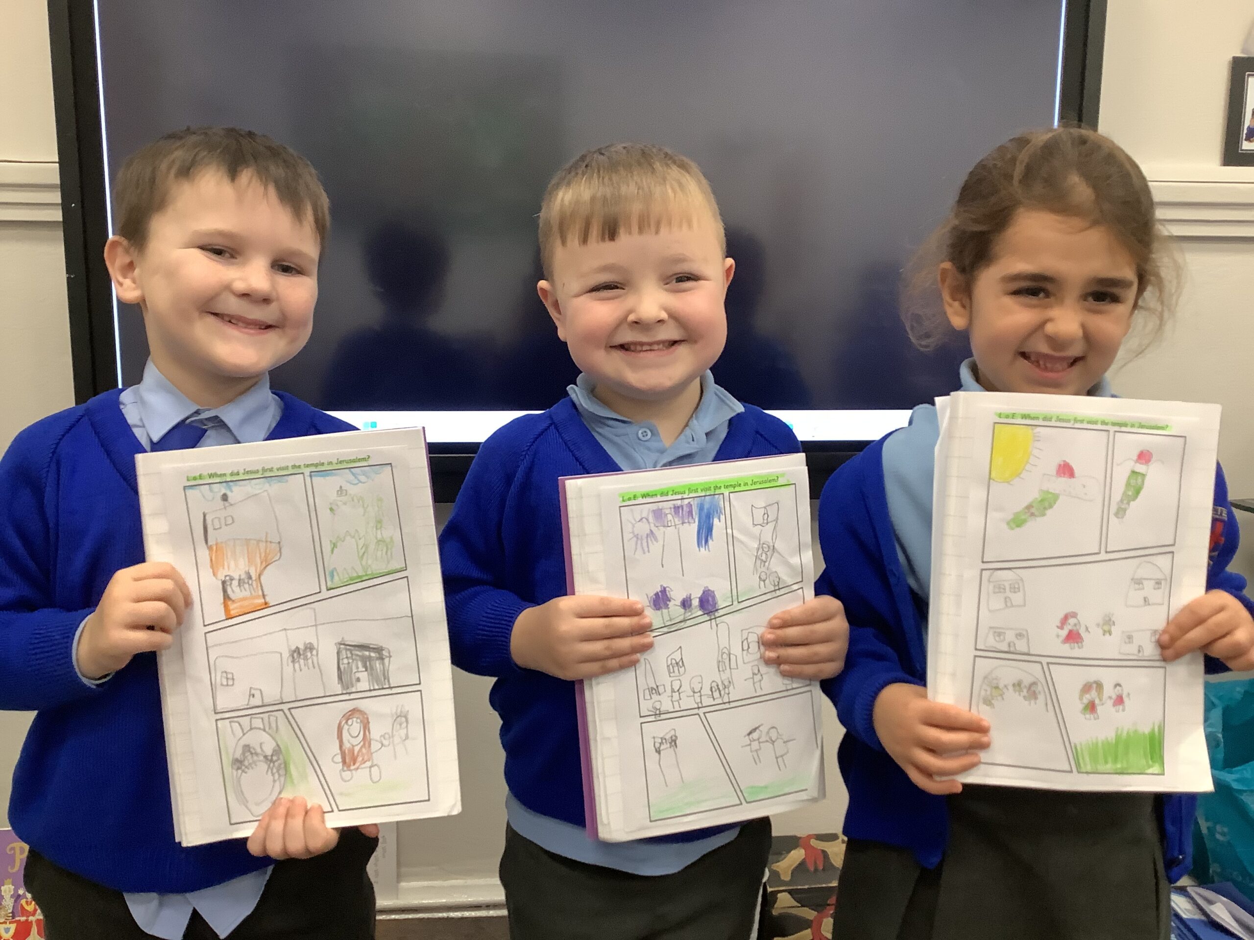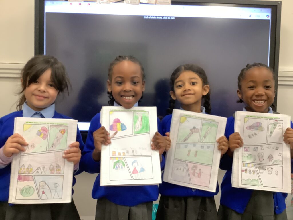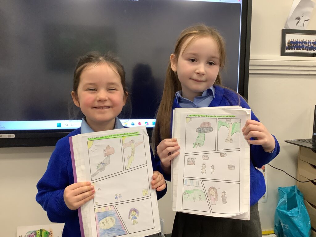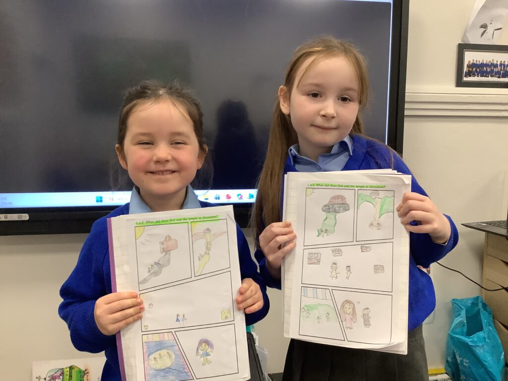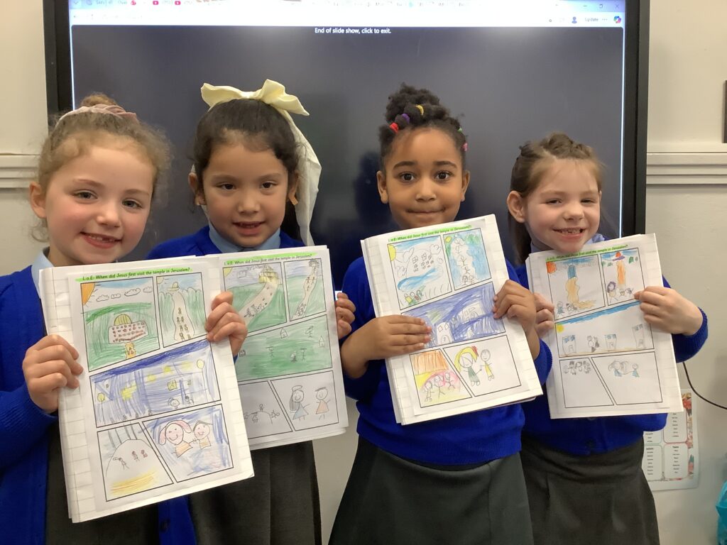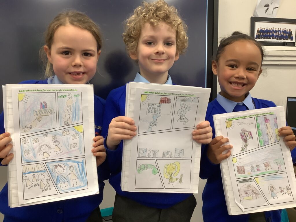 In RE, the children have been learning about Jesus’ life as a child. The children have talked about the few stories in the Bible about this time in Jesus’ life. One piece of scripture we have read is Jesus in the Temple. The children created a comic strip of the story and were able to retell it to their friends.
