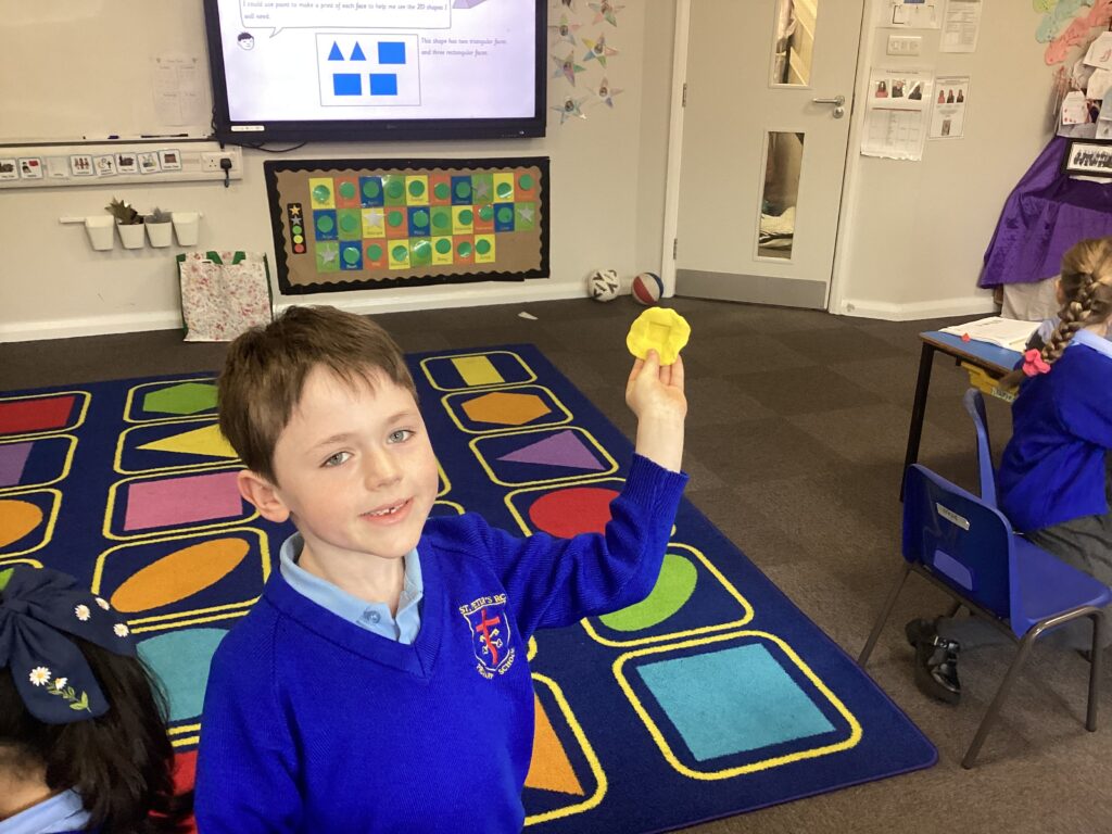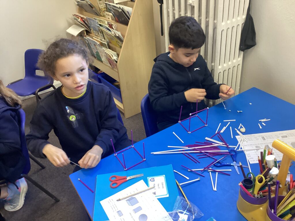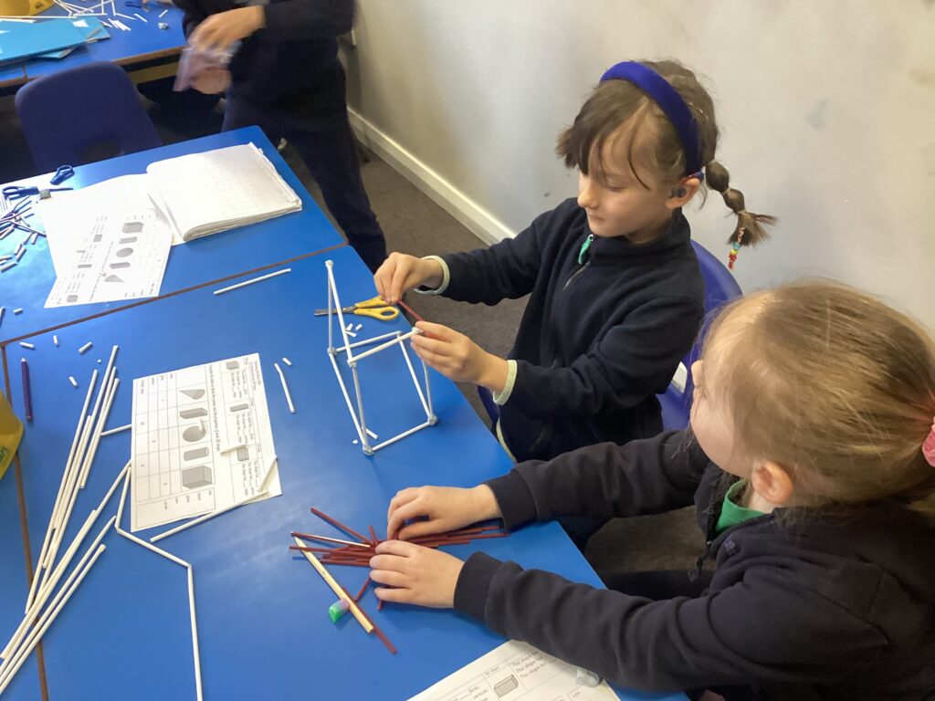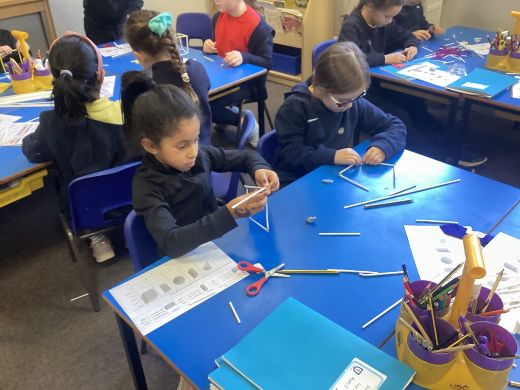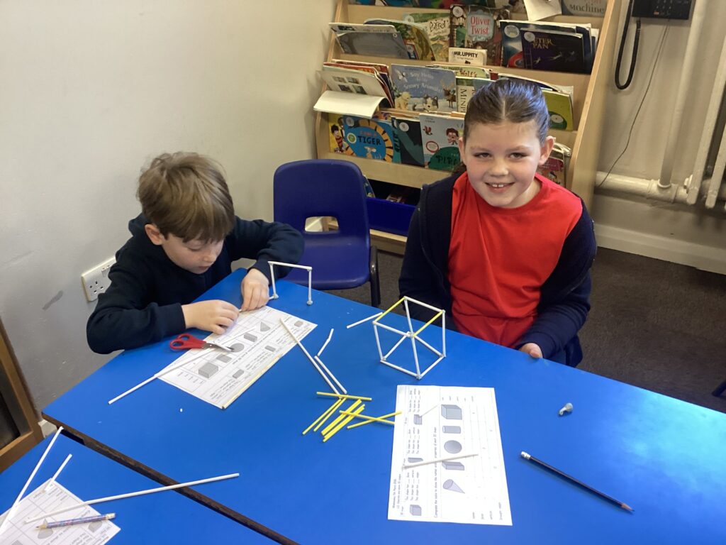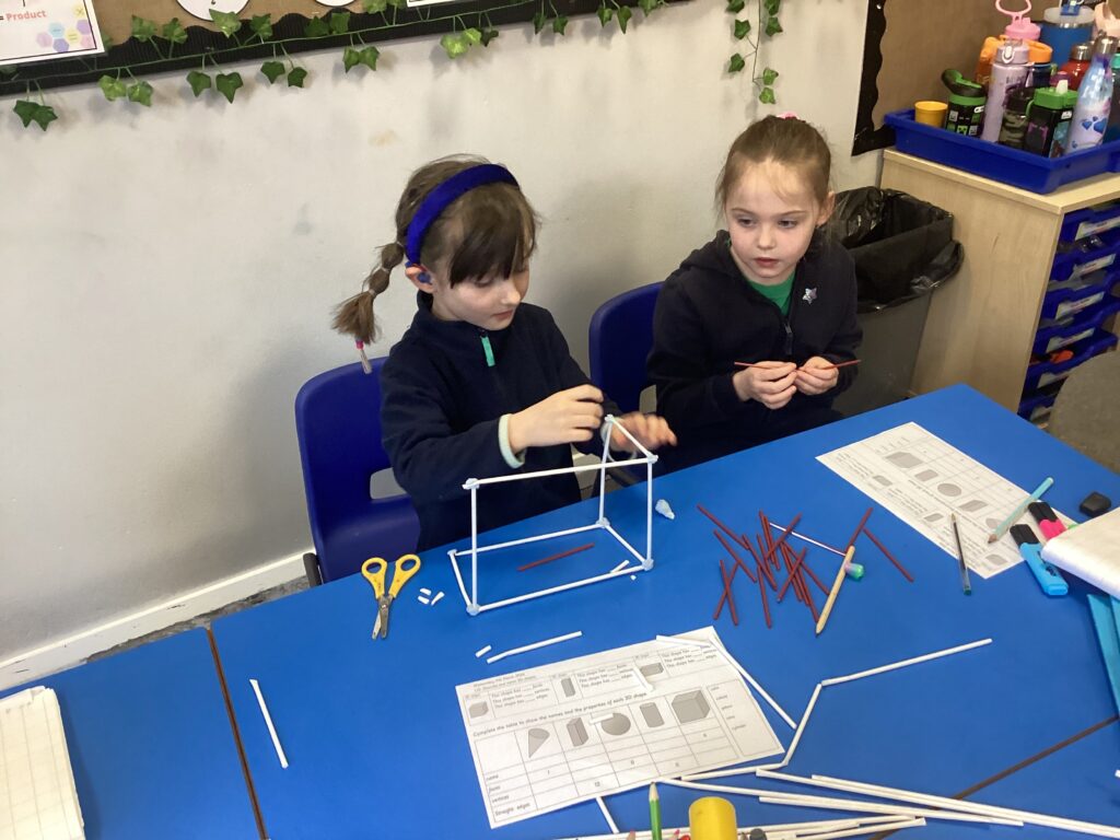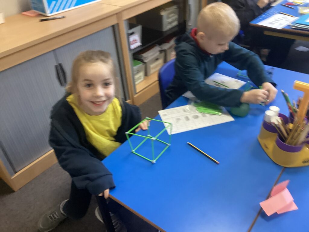 This week in our Maths lessons we have been looking at 3D shapes. We used mathematical vocabulary to name and describe each shape. We identified the 2D shapes we could see in 3D shapes and used nets to make our own 3D shapes. To help us describe the shapes, we built some shapes with straws and plasticine to help us count the number of faces, edges and vertices.
