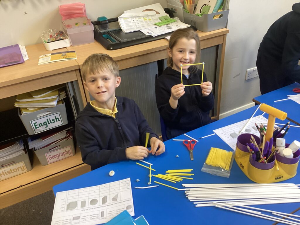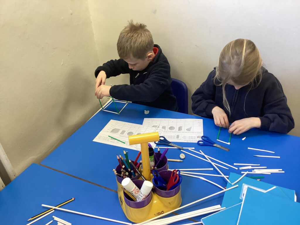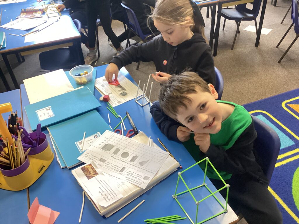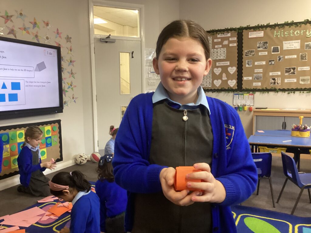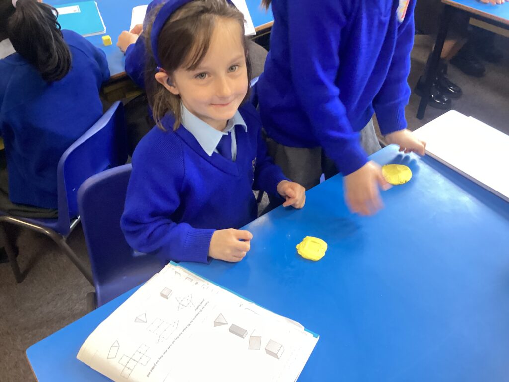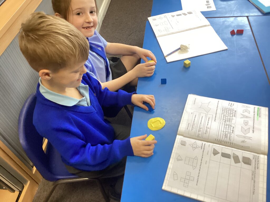 This week in our Maths lessons we have been looking at 3D shapes. We used mathematical vocabulary to name and describe each shape. We identified the 2D shapes we could see in 3D shapes and used nets to make our own 3D shapes. To help us describe the shapes, we built some shapes with straws and plasticine to help us count the number of faces, edges and vertices.