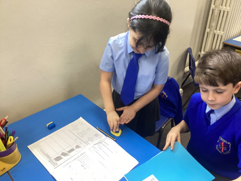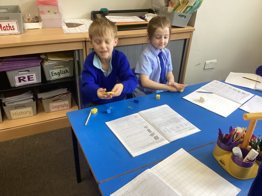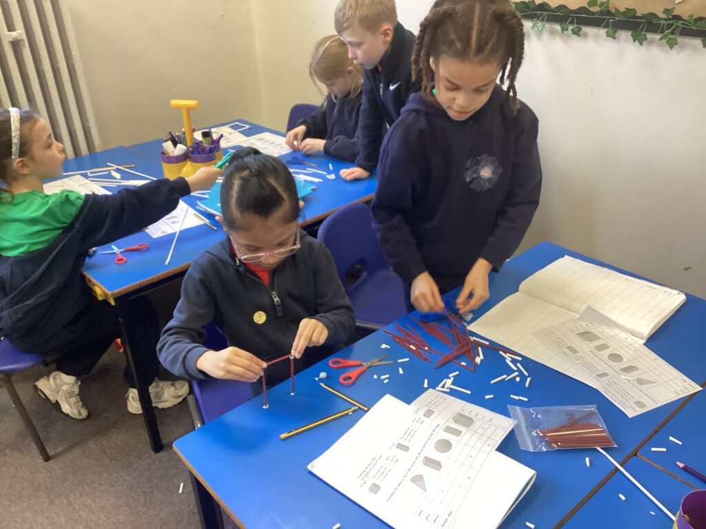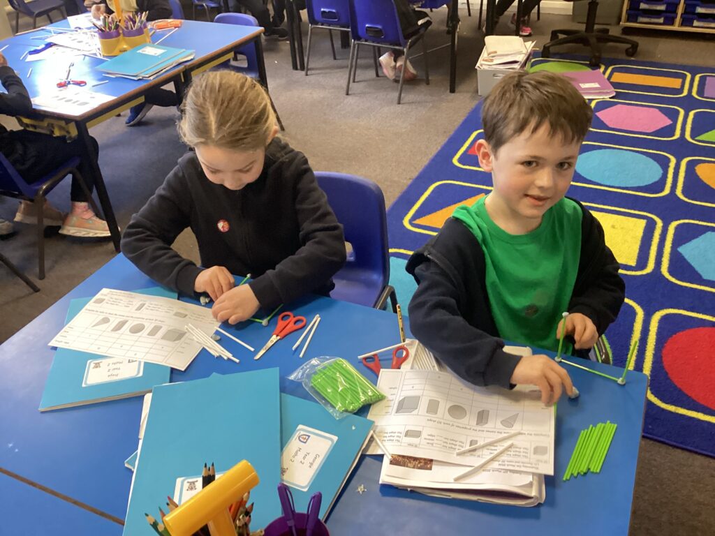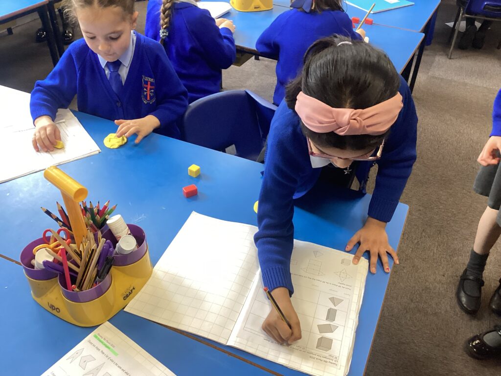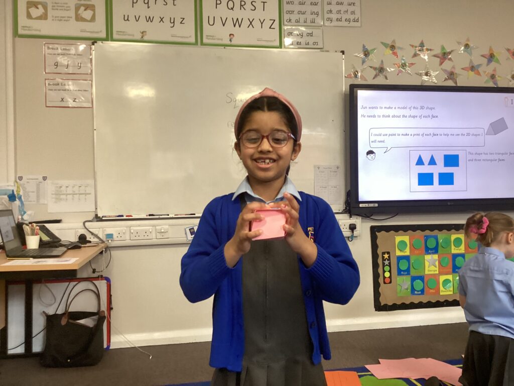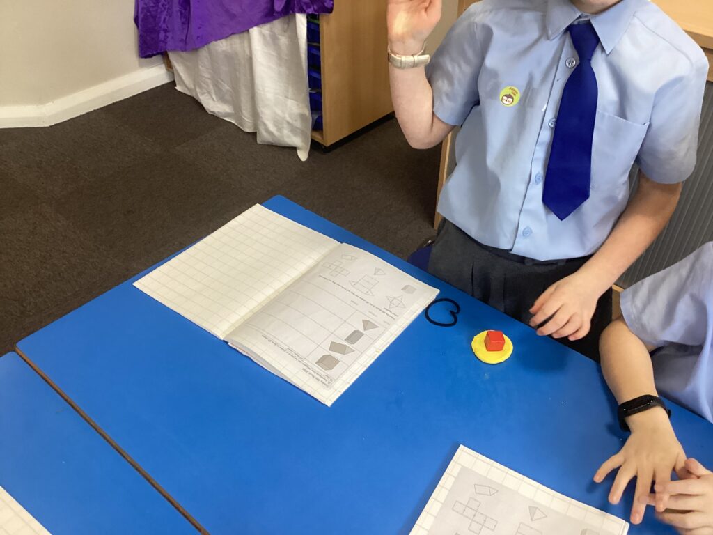 This week in our Maths lessons we have been looking at 3D shapes. We used mathematical vocabulary to name and describe each shape. We identified the 2D shapes we could see in 3D shapes and used nets to make our own 3D shapes. To help us describe the shapes, we built some shapes with straws and plasticine to help us count the number of faces, edges and vertices.