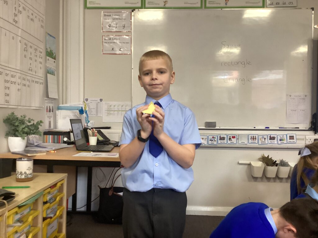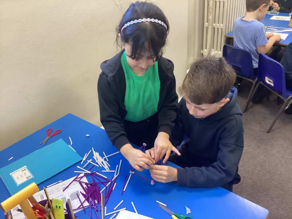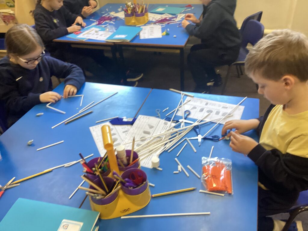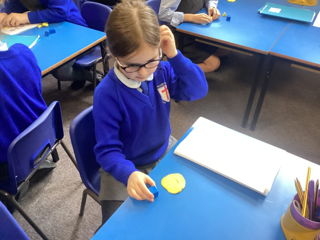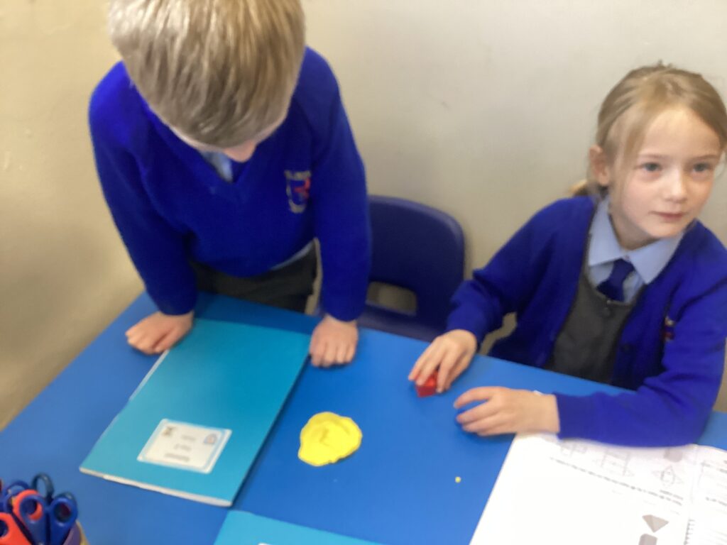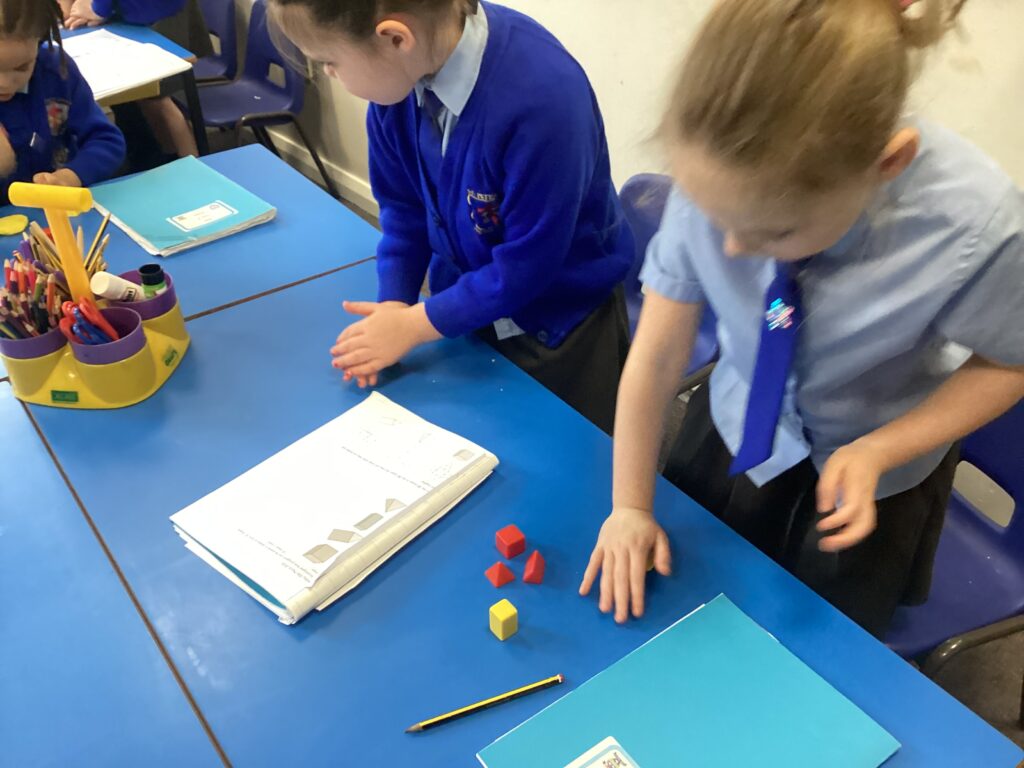 This week in our Maths lessons we have been looking at 3D shapes. We used mathematical vocabulary to name and describe each shape. We identified the 2D shapes we could see in 3D shapes and used nets to make our own 3D shapes. To help us describe the shapes, we built some shapes with straws and plasticine to help us count the number of faces, edges and vertices.