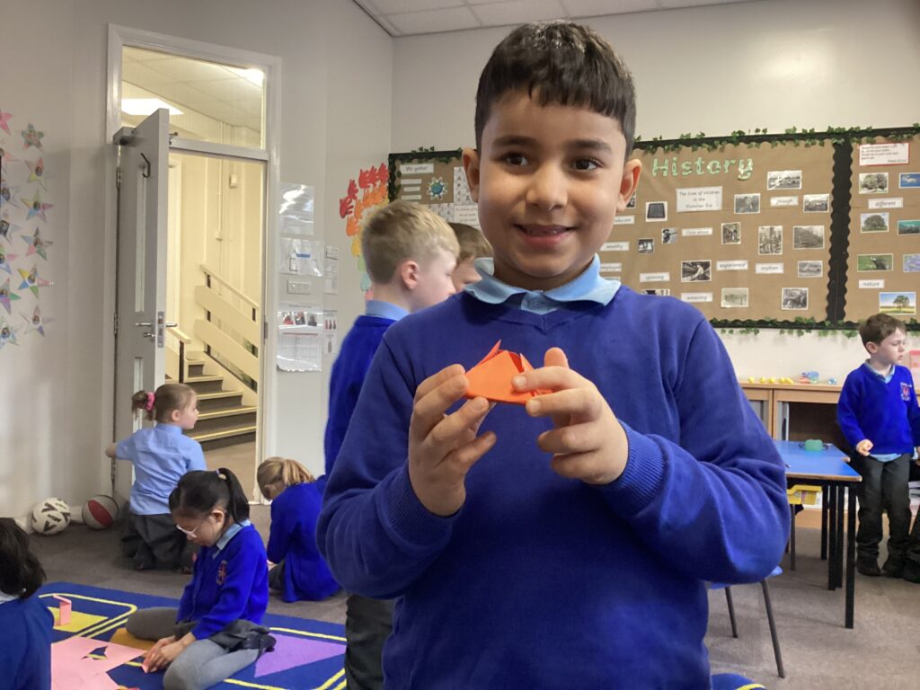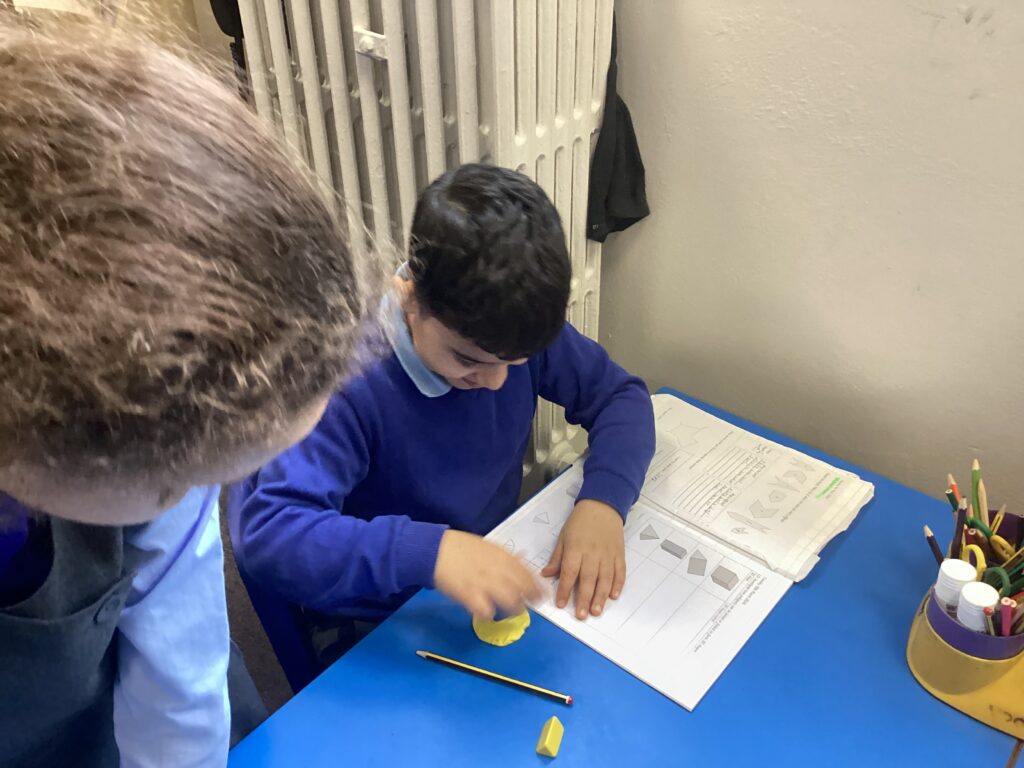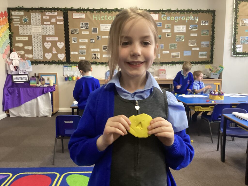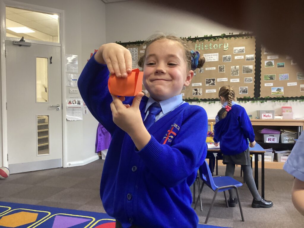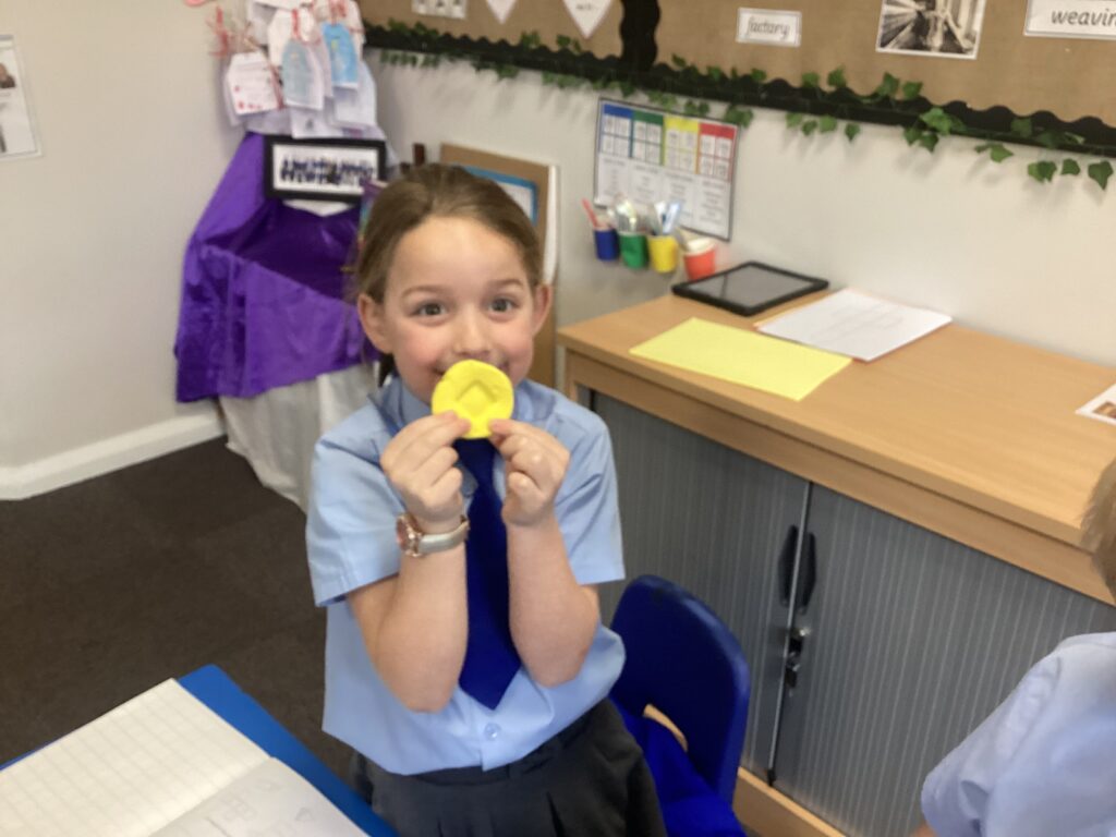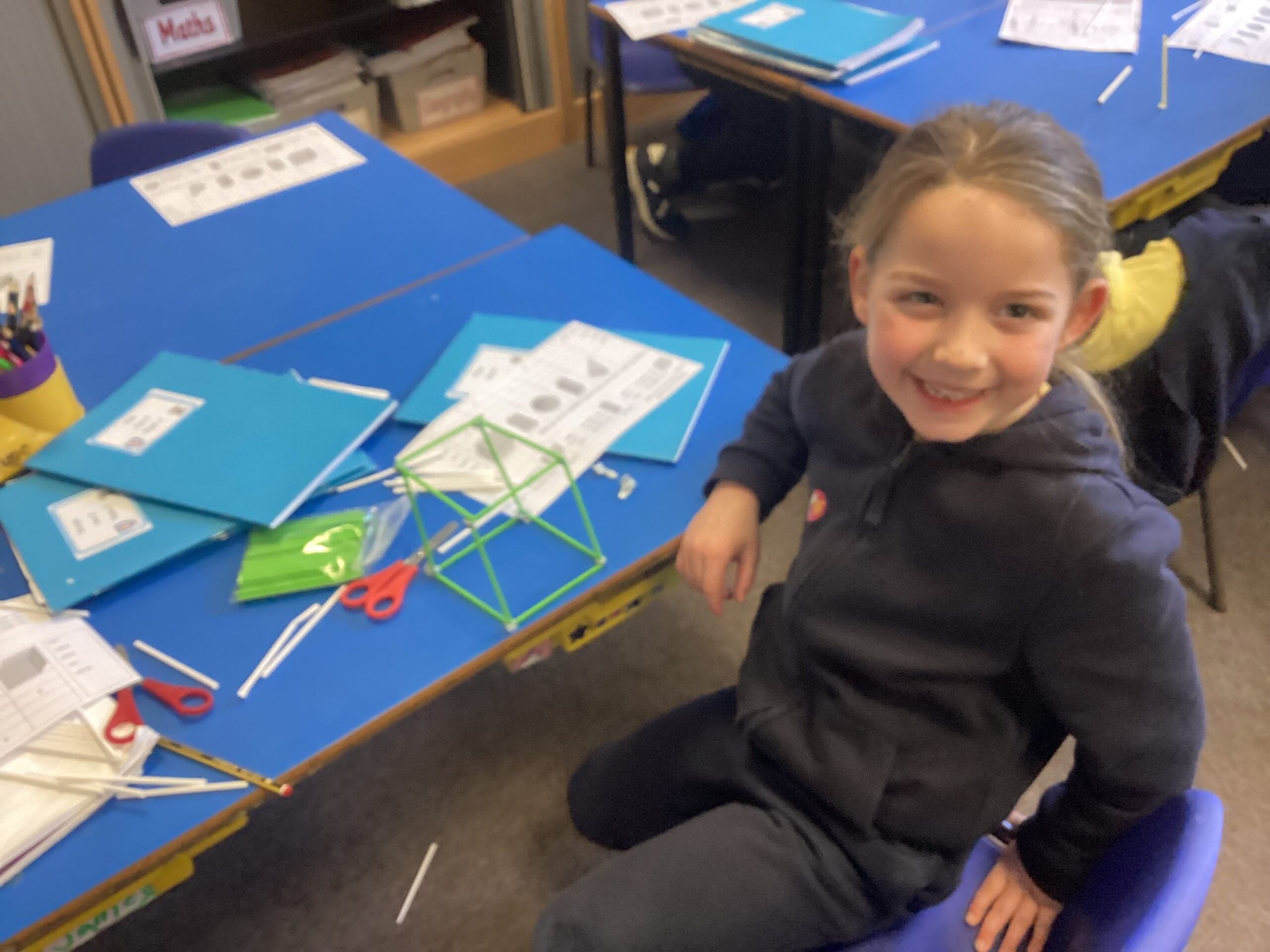 This week in our Maths lessons we have been looking at 3D shapes. We used mathematical vocabulary to name and describe each shape. We identified the 2D shapes we could see in 3D shapes and used nets to make our own 3D shapes. To help us describe the shapes, we built some shapes with straws and plasticine to help us count the number of faces, edges and vertices.